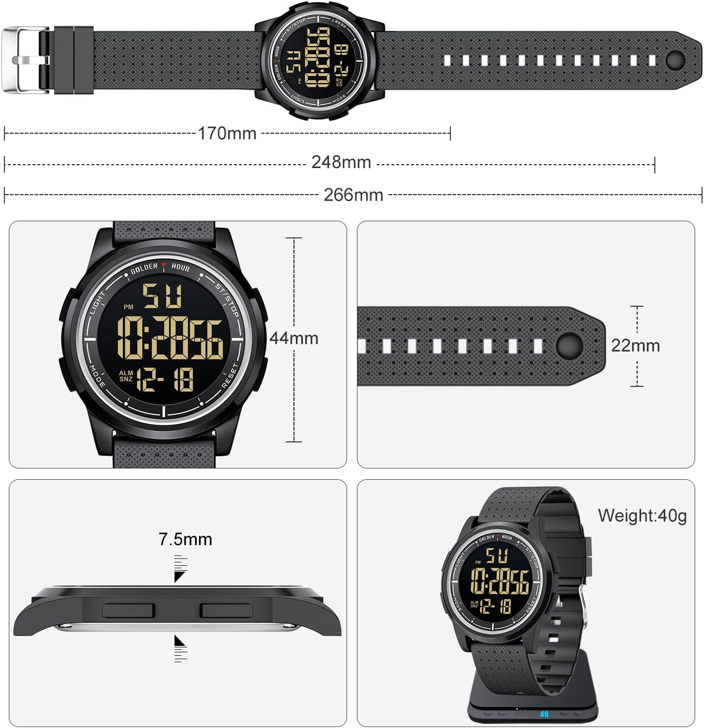 Stopwatch.LED backlight.Simple readable digital show.Alarm.Calendar- Date/Week show.12/24-Hour time format.Shockproof.